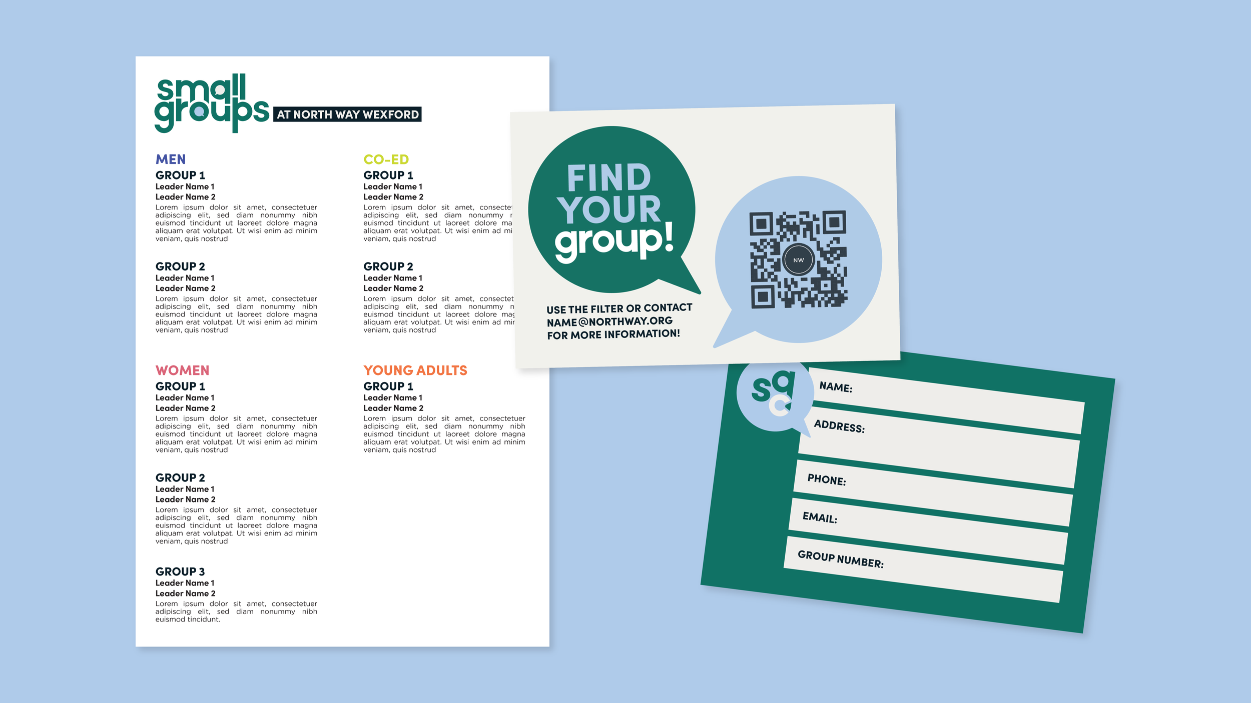 Below is the Small Group Connect rebrand and marketing collateral, a project developed by the North Way Creative Team and executed by me.