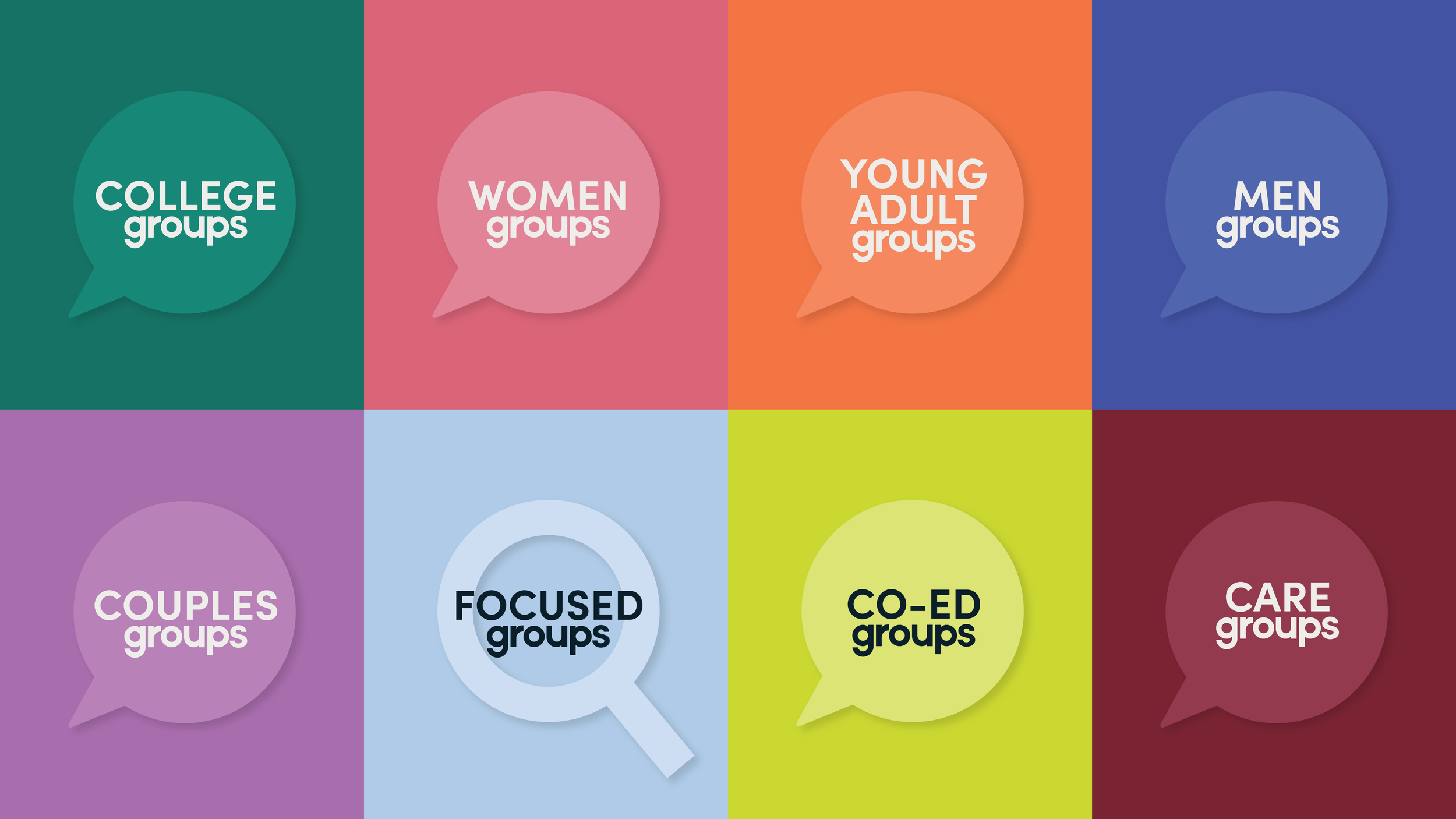 As the Senior Designer, my mission was to enliven the brand with an inviting identity and plenty of color. The new logo, featuring speech bubbles, balances fun and intentionality, perfectly capturing the theme of communication in small groups. I also created a broad color palette, which was a creative challenge, but it was crucial for differentiating the many types of groups while maintaining a cohesive feel.